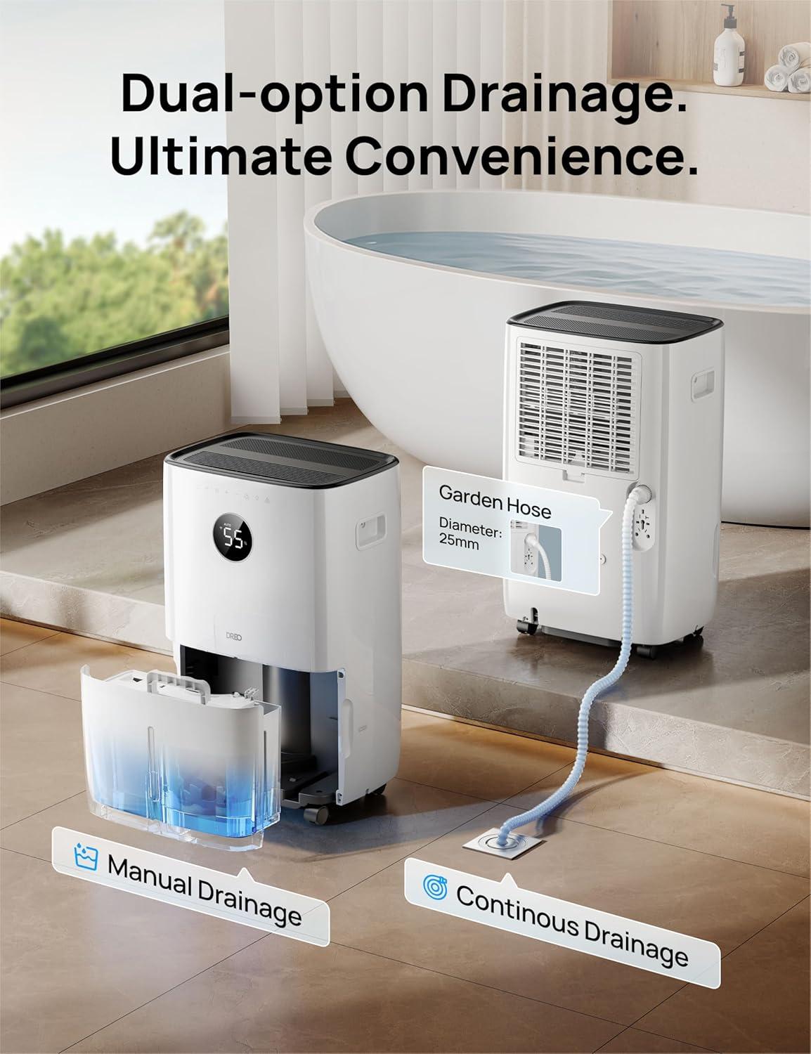 Dual-Option Drainage: Thanks to its 2 gallon (8L) extra-large water tank, the Dreo dehumidifier can operate continuously for over 8 hours without needing drainage. When full, the LED display illuminates a water-full alert and automatically stops operation. You can manual empty the water tank, or there is also a drain hose outlet for continuous draining. Dual-drainage system adapts to any environment, from basements to garden.