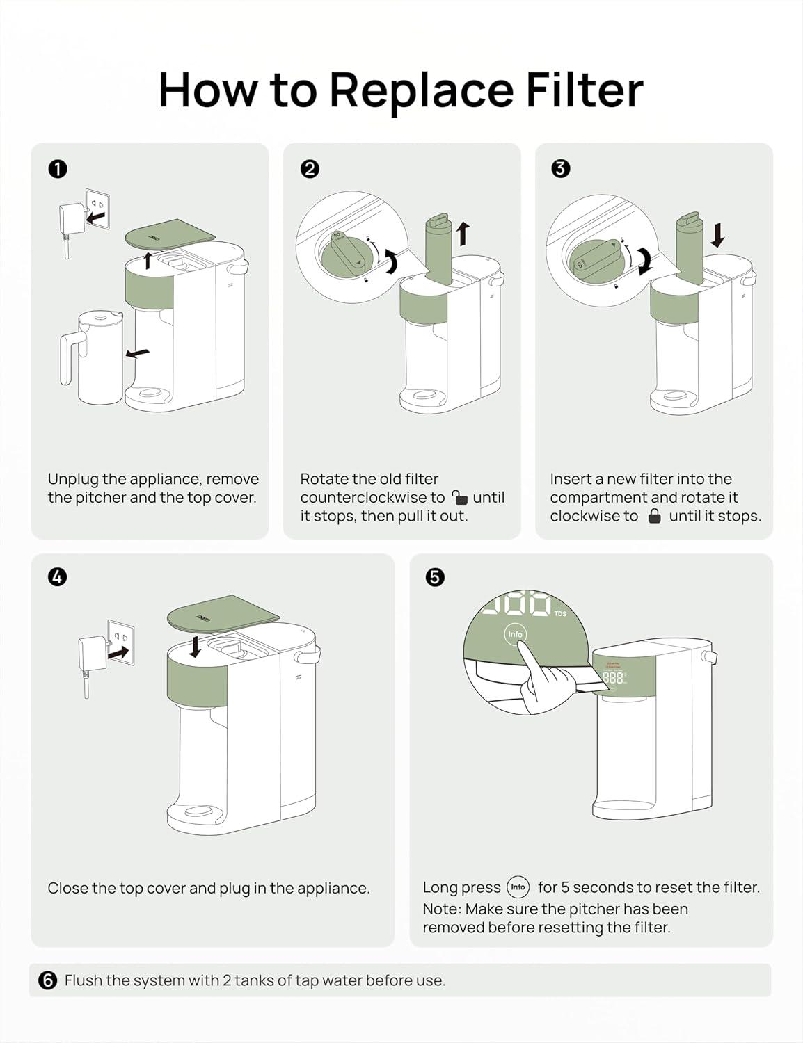 ๐๐ถ๐ณ๐ฒ๐๐ฝ๐ฎ๐ป: To maintain high water quality, it's recommended to replace the DREO 7-in-1 RO Filter every 6-12 month