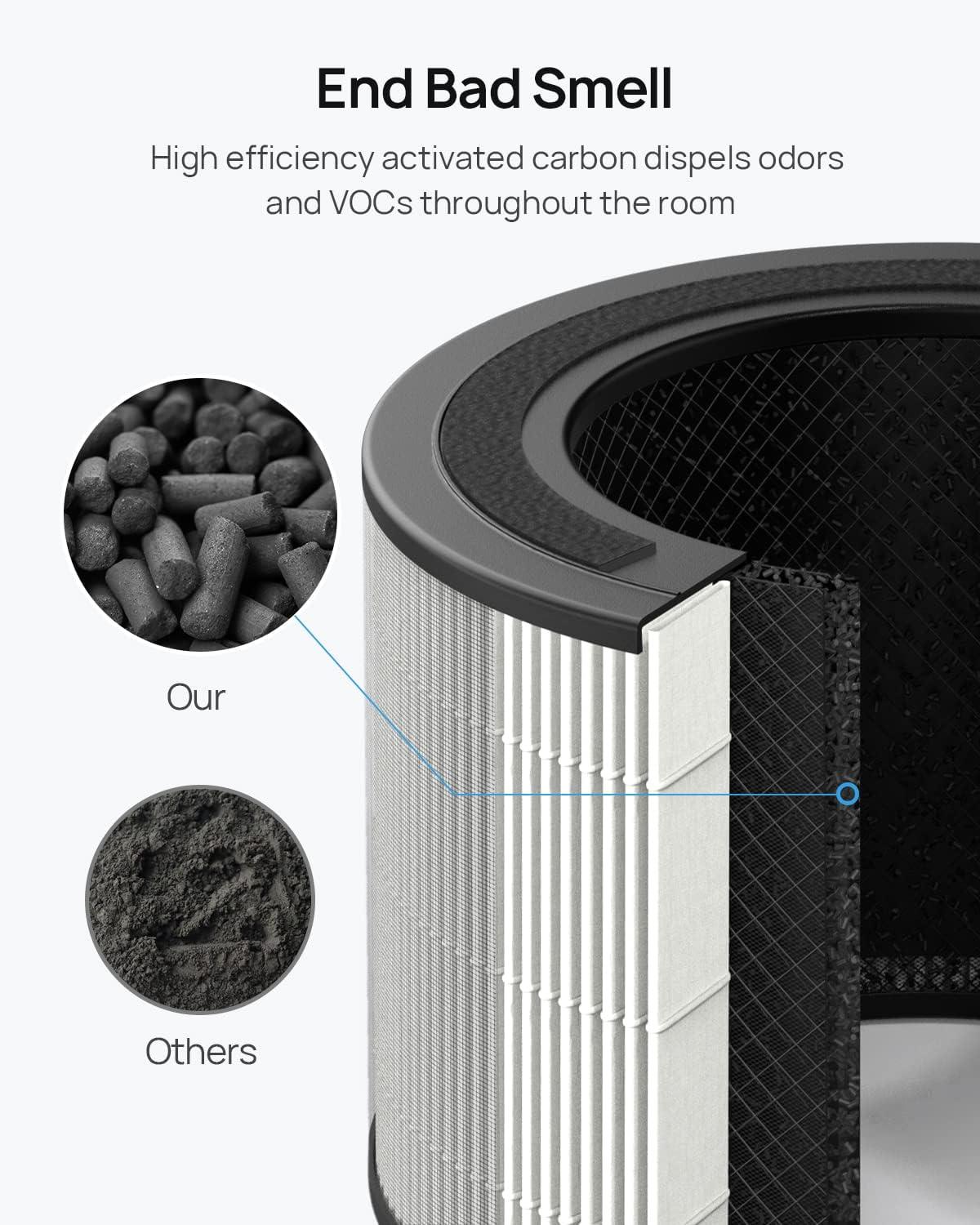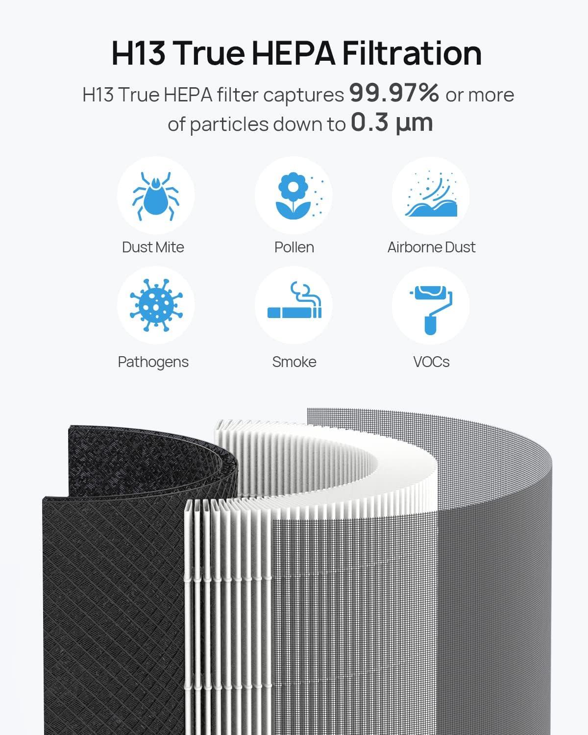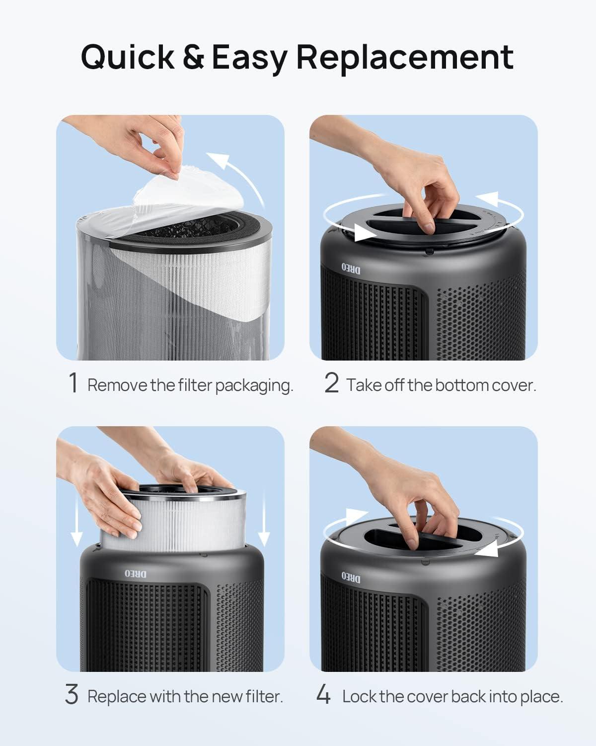 Genuine Replacement Filter for Dreo Macro Pro Air Purifier. Ozone-free and improves air quality efficiently with 3-in-1 deep filtration system, composed of Ultra-Fine Pre-Filter, 3-in-1 Filter, and High Efficiency Activated Carbon Filter.