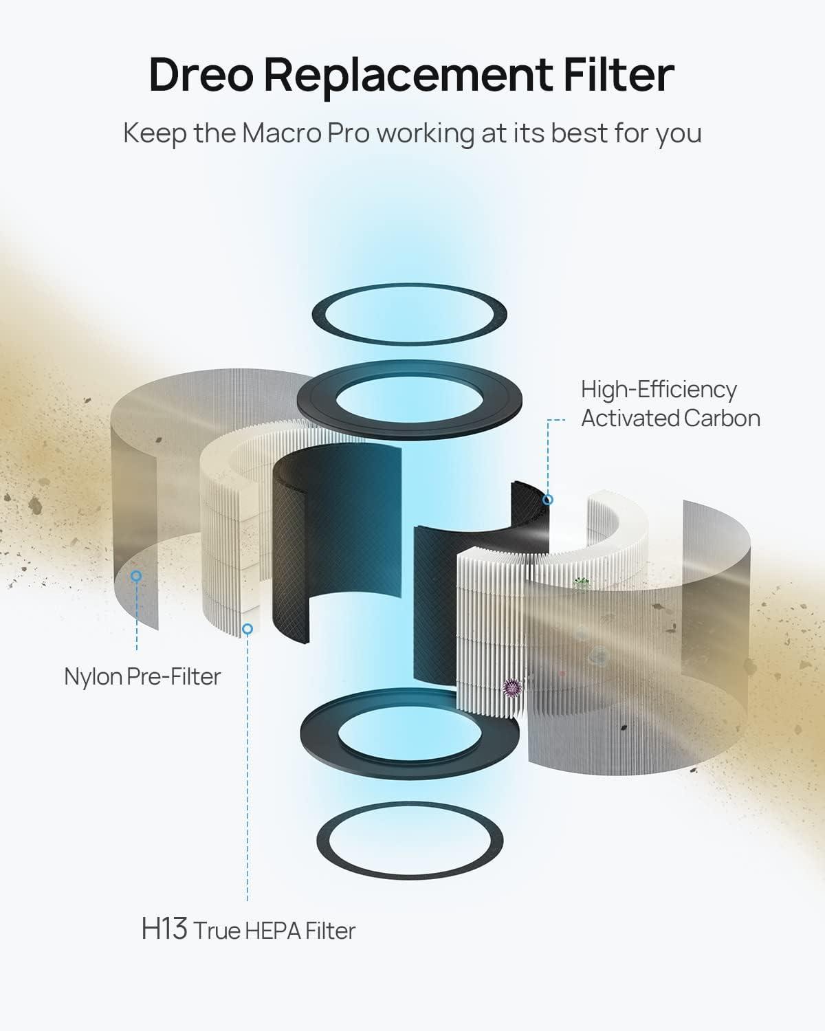 Genuine Dreo replacement Filter: Genuine Replacement Filter for Dreo Macro Pro Air Purifier. Ozone-free and improves air quality efficiently with 3-in-1 deep filtration system, composed of Ultra-Fine Pre-Filter,and High Efficiency Activated Carbon Filter.