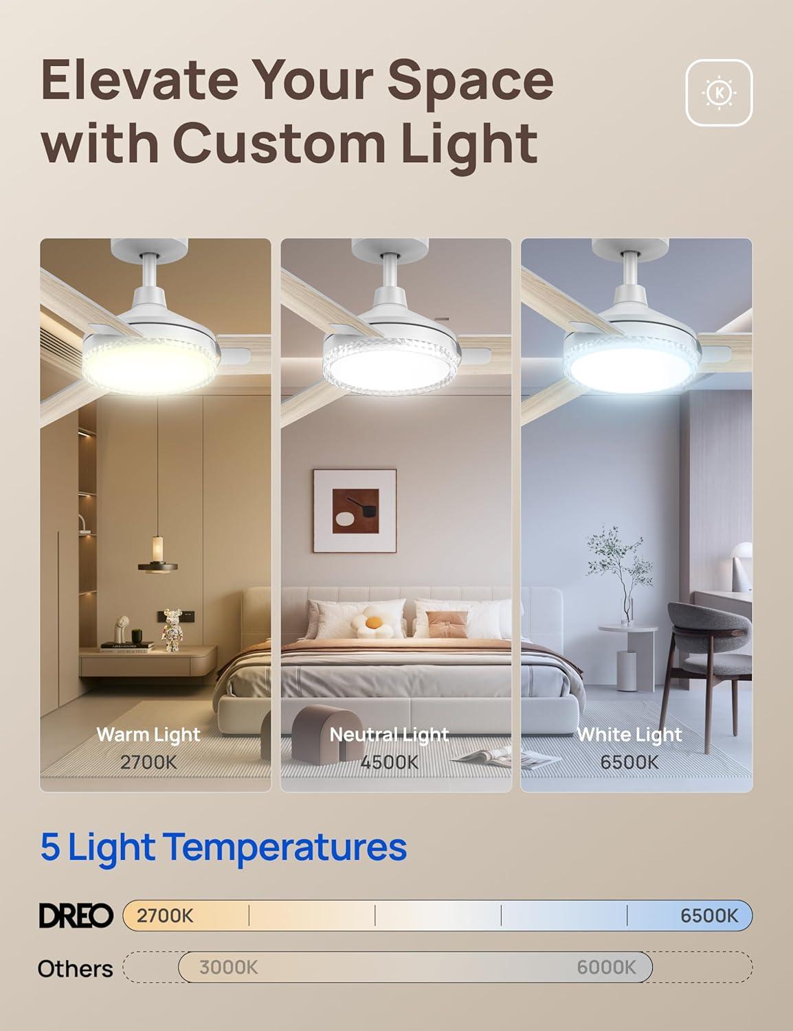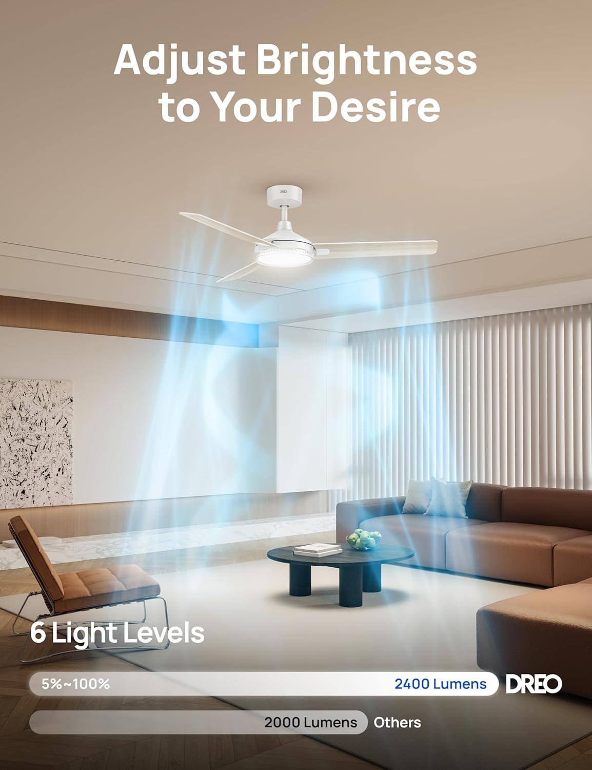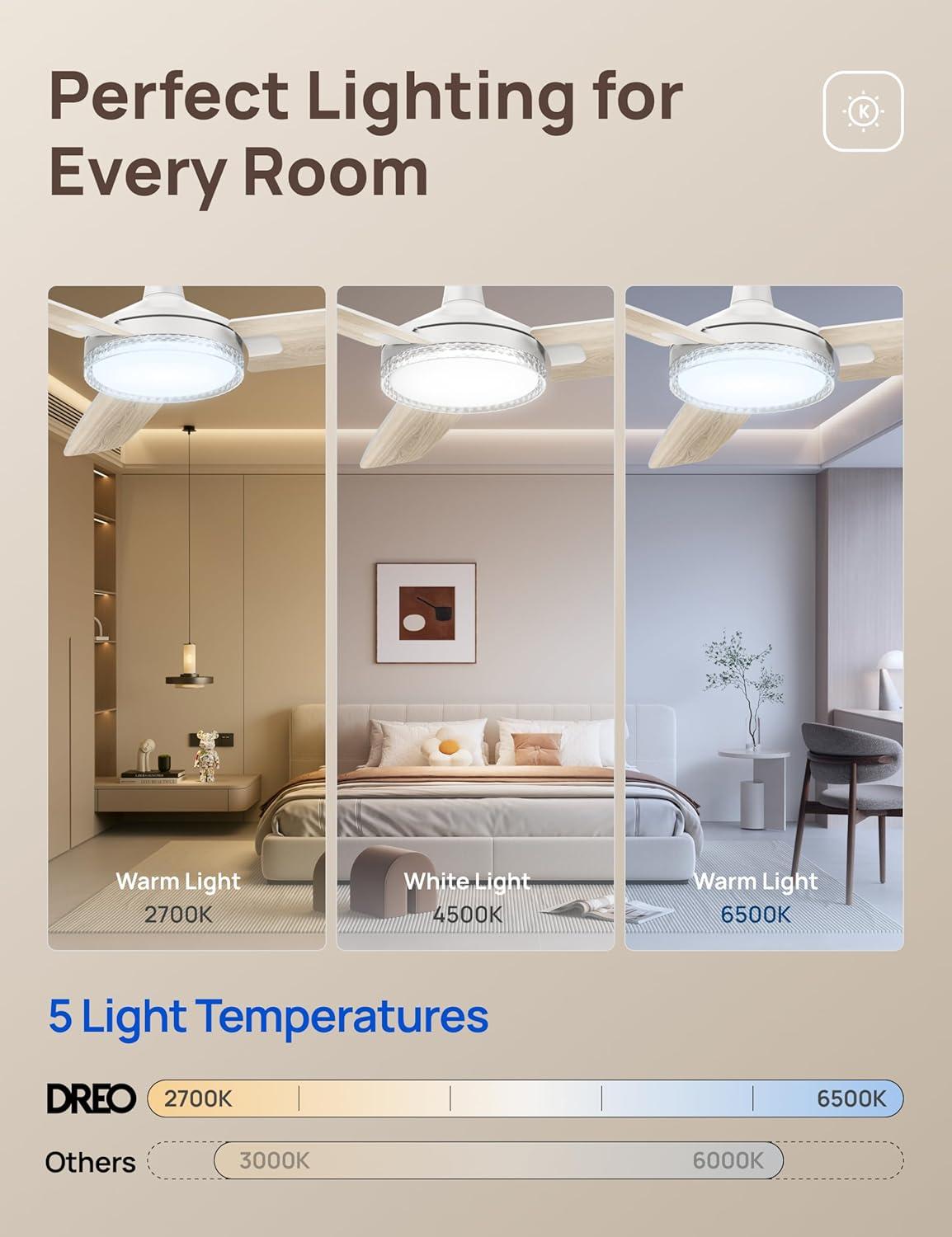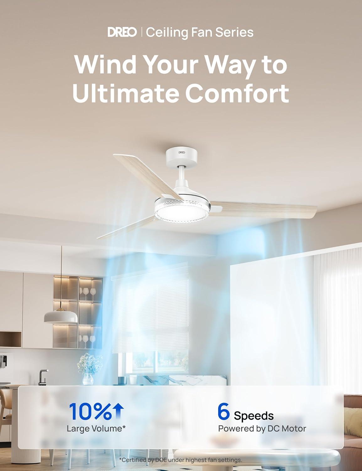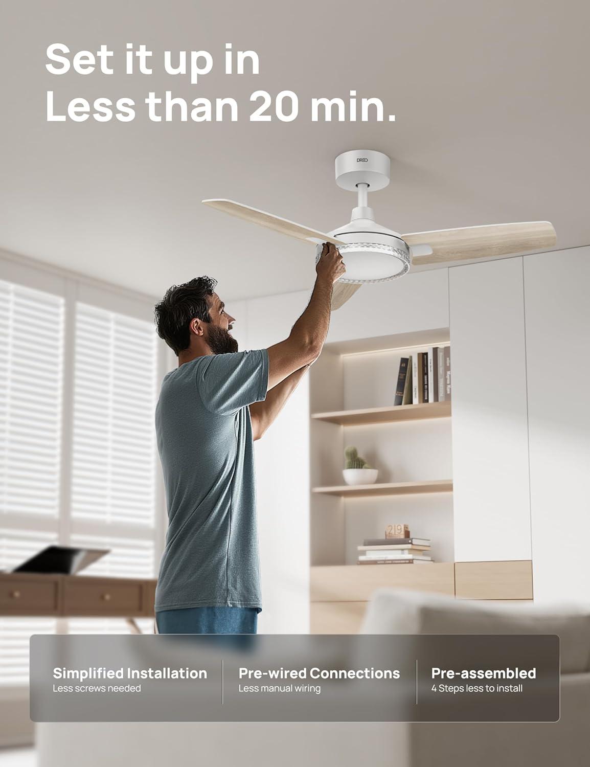 Effortless Installation, Efficient Performance: DREO's pre-assembled ceiling fan with lights installs in 20 minutes with 4 steps. Watch our video for guidance. Free accessory replacement. Trust DREO, certified by FTC, ETL, DOE, for energy savings & reliability. Need help? We're here!