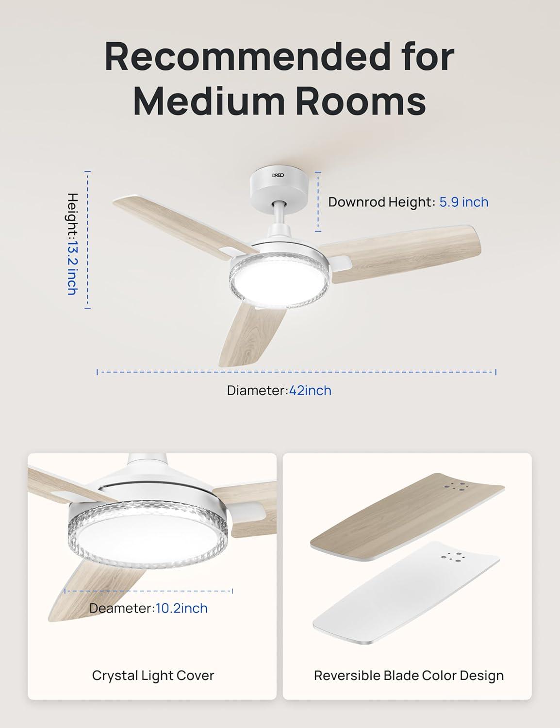 Practical meets decorative: The Dreo 42-inch ceiling fan with light and 3 double-sided fan blades. Acrylic cover with flicker-free LED light source for a softer light. The simple and modern design style makes your room more stylish and upscale. It is perfect for any indoor and covered dining room, kitchen, living room, bedroom and more.