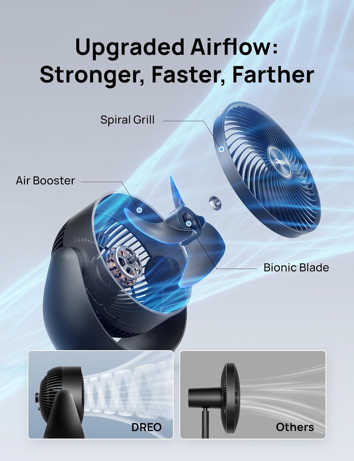 𝙒𝙝𝙞𝙨𝙥𝙚𝙧-𝙦𝙪𝙞𝙚𝙩 𝙗𝙧𝙚𝙚𝙯𝙚, 𝙥𝙚𝙧𝙛𝙚𝙘𝙩 𝙘𝙤𝙢𝙛𝙤𝙧𝙩: The Dreo desktop circulator fan delivers cooling comfort with near-silent operation. Thanks to its unique blades, noise is reduced to only 28dB, offering a quiet, relaxing space for work or rest.