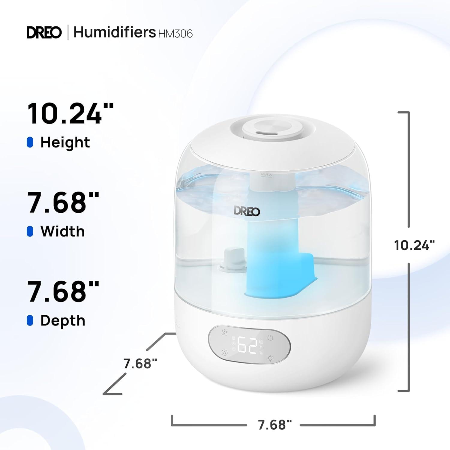 Dreo Humidifiers for Bedroom, 3L Top Fill 30H & 26dB Quiet Runtime for Large Room, Cool Mist Ultrasonic Humidifier with Humidity Sensor, Night Light for Home, Baby, Nursery, Plants, 360ยฐ Nozzle, White