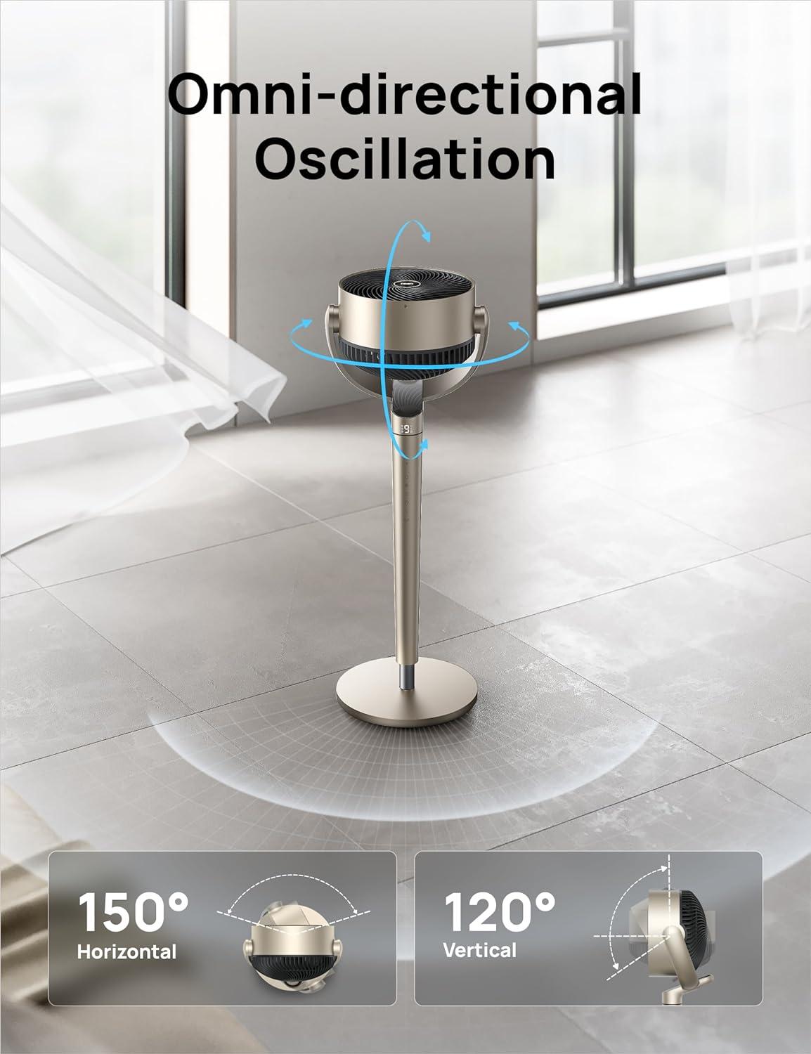 𝙊𝙢𝙣𝙞-𝙙𝙞𝙧𝙚𝙘𝙩𝙞𝙤𝙣𝙖𝙡 𝙊𝙨𝙘𝙞𝙡𝙡𝙖𝙩𝙞𝙤𝙣: Unlike most fans, this oscillating fan bringing simultaneous 150˚ horizontal and 120˚ vertical oscillation and an adjustable pedestal of 37.5-43 inches for more flexibility. Customize it to any angle and direction on the DREO app as you like and bring comfort to each space of room.