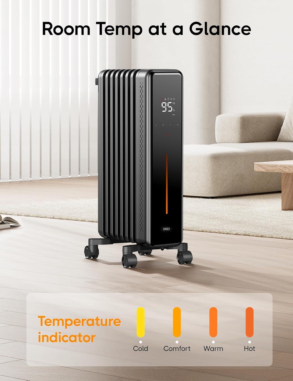 Precision Control, Ultimate Comfort: With Dreo's dedicated thermal sensor and dynamic compensation algorithm, boasting an error as low as ± 4%, you can truly set the temperature that makes you feel most comfortable. And equipped with an ambient temperature indicator that automatically adjusts based on your room's temperature, this radiator heater allows you to effortlessly monitor the room's temperature at a single glance, providing a more enjoyable experience