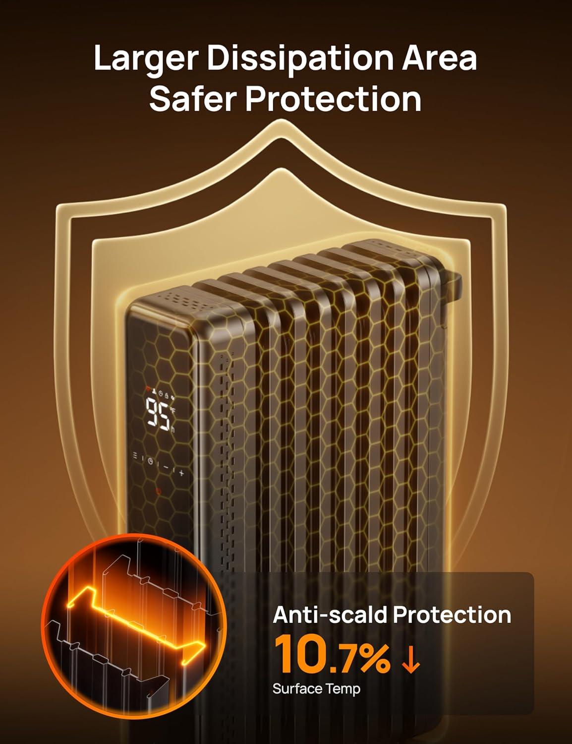 Top-tier Whole Room Heat: The eight M-shaped fins in this oil-filled radiator heater ensure a 59.5% higher dissipation area, providing wide and even distribution of warmth throughout your home while maintaining a safe temperature on the surface of the radiator to avoid scalding. Whether used in any room, it always delivers comfortable and consistent warmth