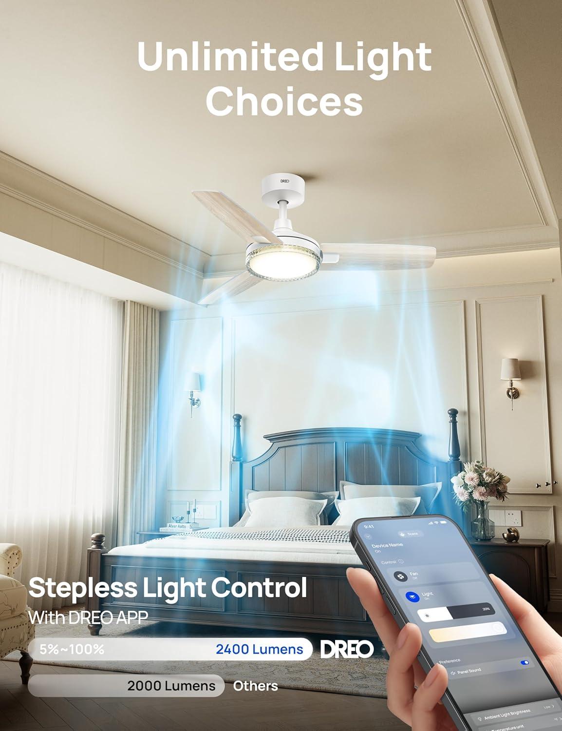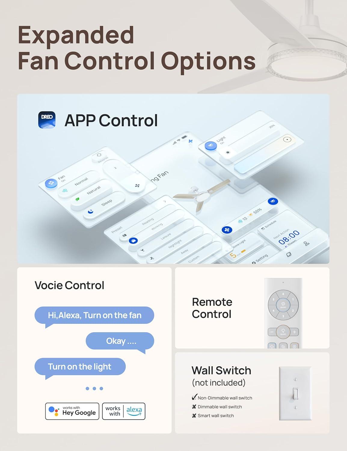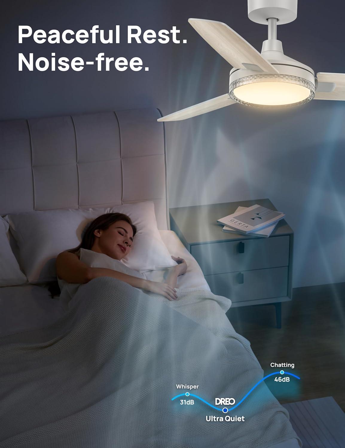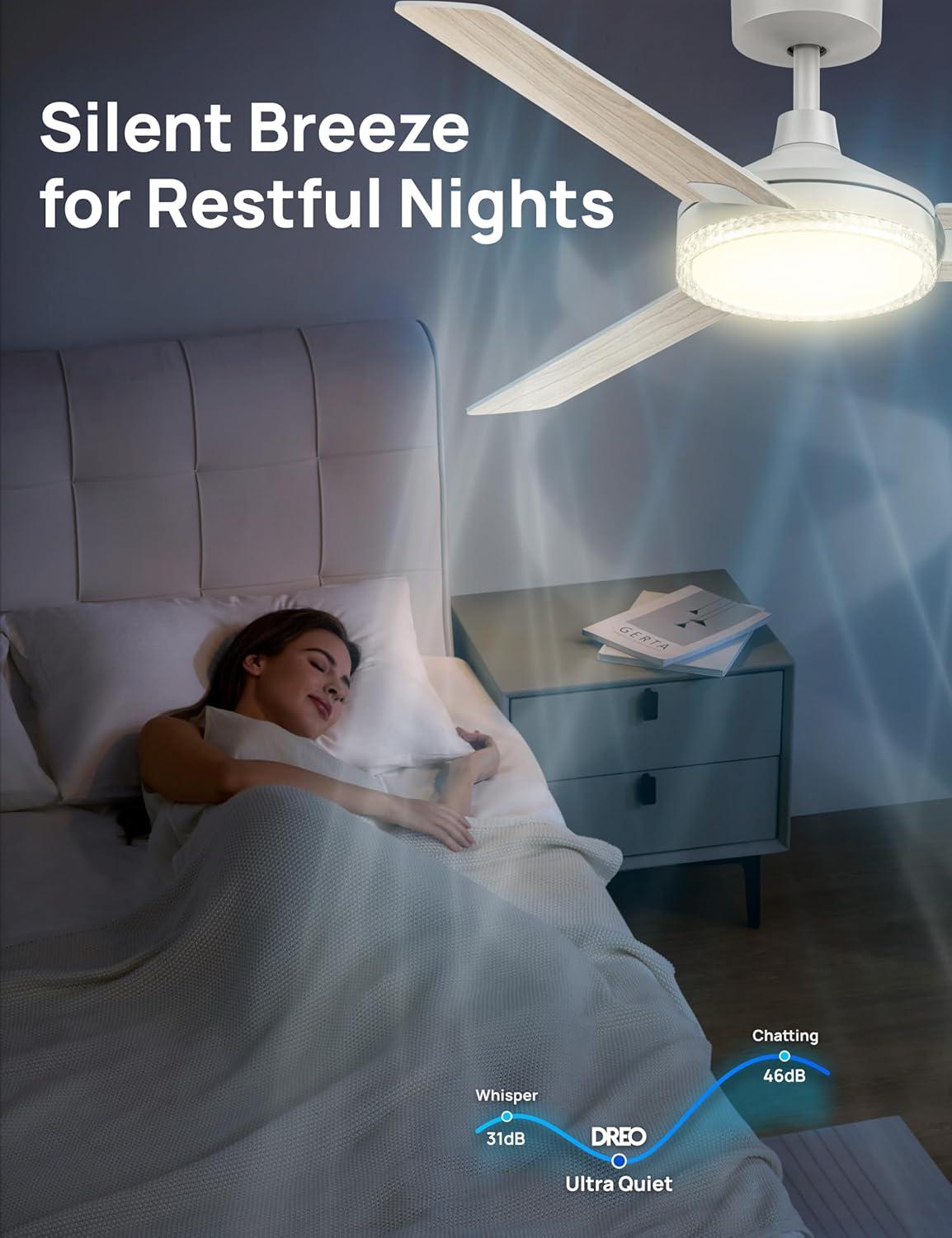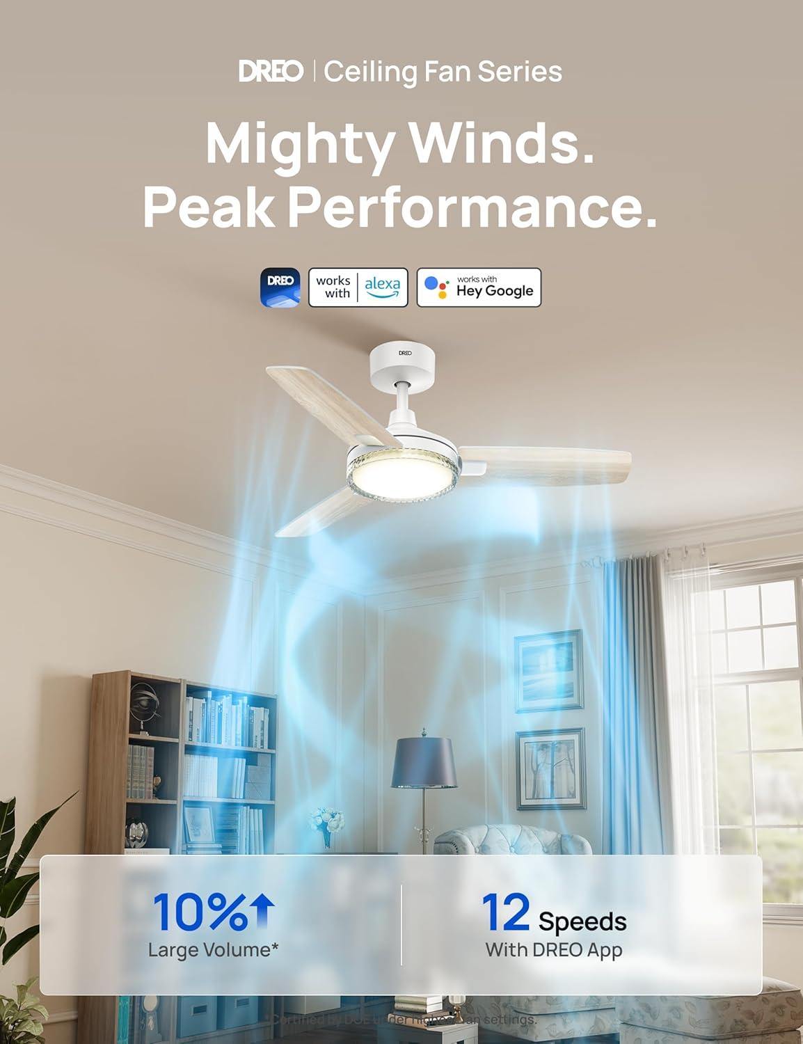 Smart Ceiling Fan Experience: Switch fan speeds, scenes, brightness and timers using the DREO app, Alexa and Google home voice commands to tailor every setting to your needs.