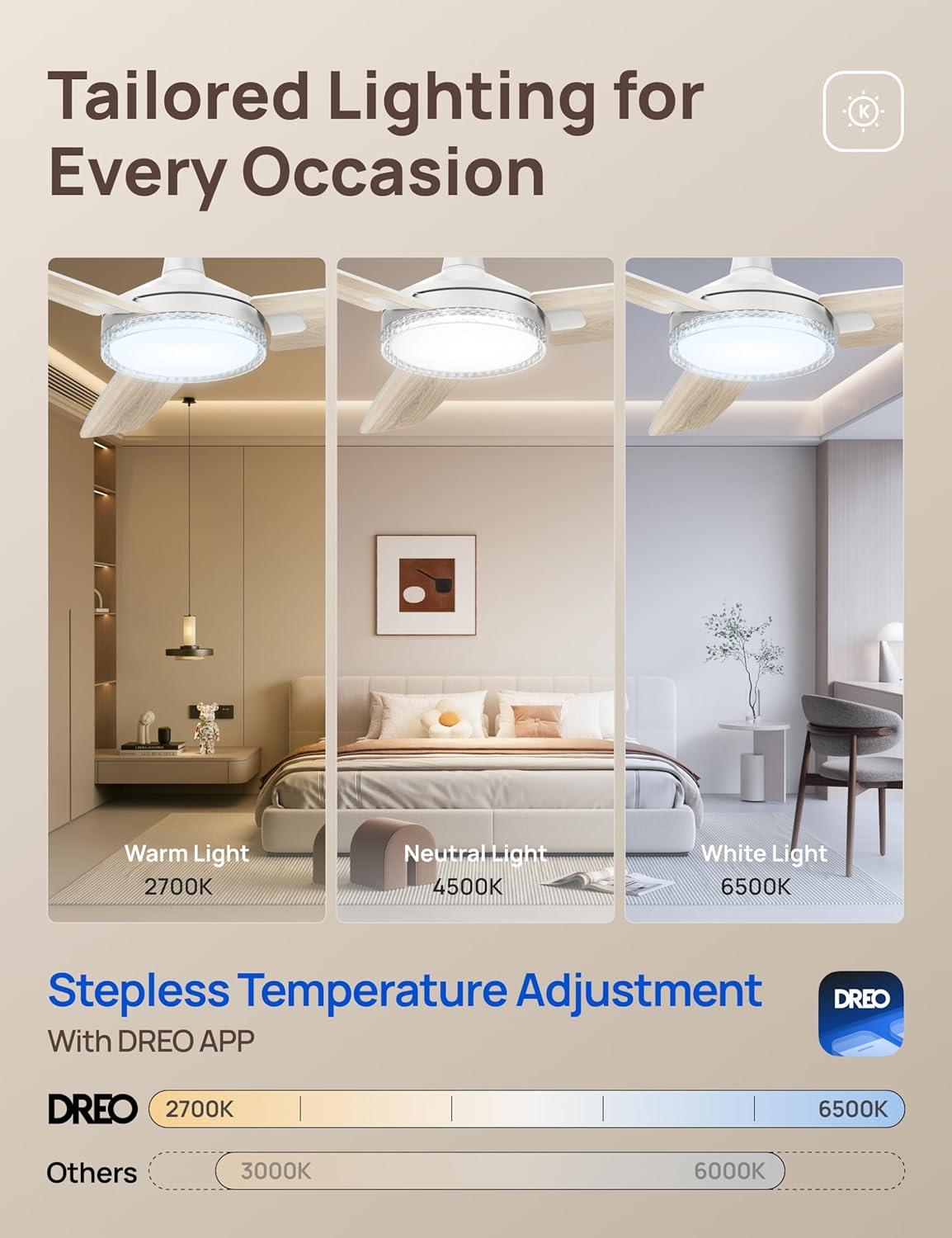 Ultra Bright Custom Lighting: The 2400lm modern ceiling fan with light features stepless brightness(5%-100%) and 27% wider color range (2700-6500K) or schedule auto-scenes like sunrise/sunset via DREO app.