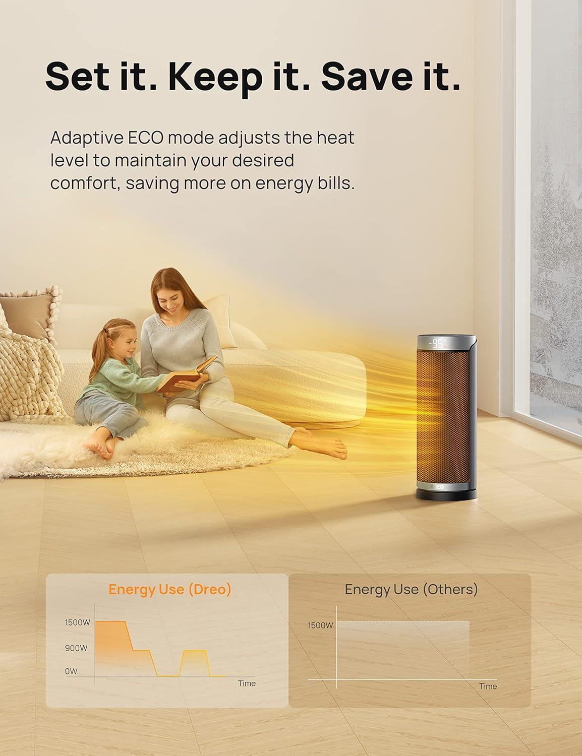 Energy Efficiency: Save on energy bills and live more sustainably. With a built-in precise temperature sensor, the smart ECO mode adjusts the working mode independently (with a low of 900W and high of 1500W to efficiently maintain your desired indoor temperature) based on the ambient temperature