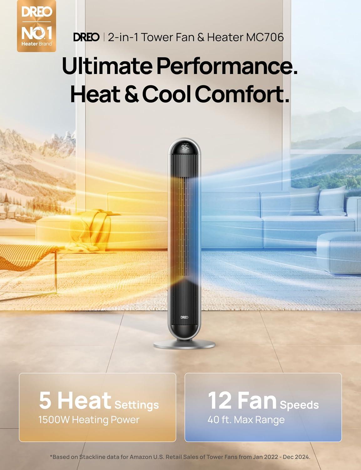 The Ultimate Fan & Heater: the DREO MC706 integrates an auto-shift tech that lets you go from a 5-level 1500W PTC room heater in winter to 12 cooling fan speeds in summer, making this 42 inch 2-in-1 heater fan for bedroom a great option for all-season use