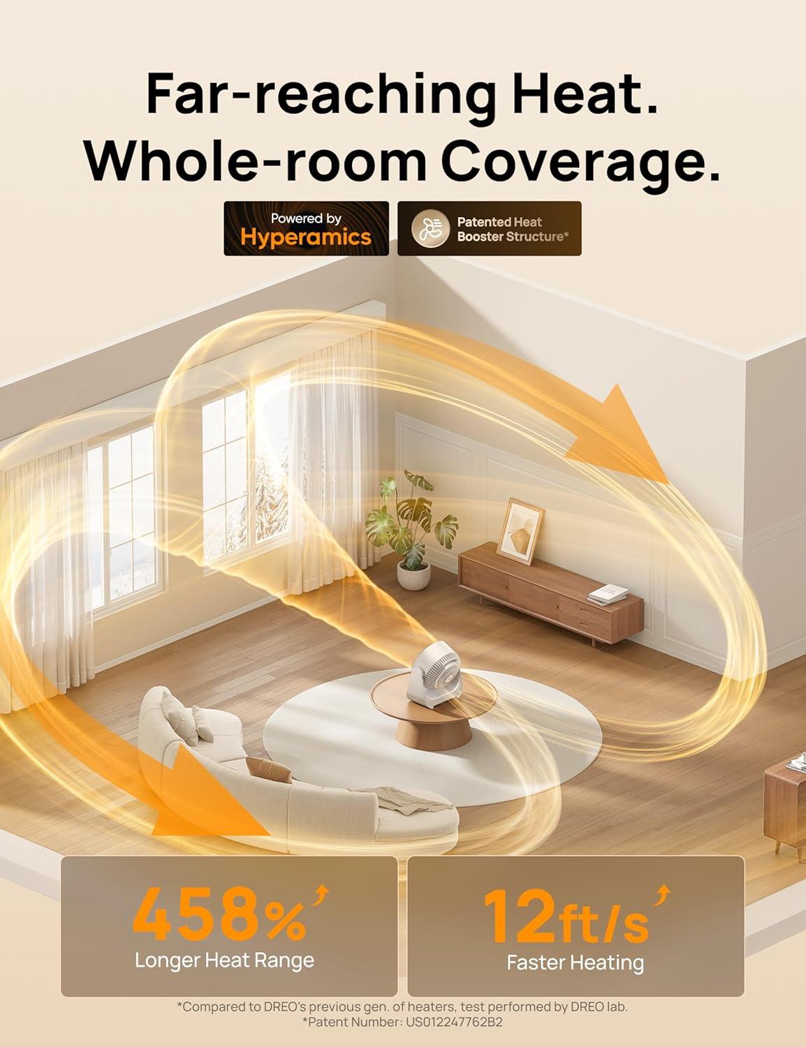 Dreo Whole Room Heater 714, 60ยฐ Vertical & 90ยฐ Horizontal 3D Oscillating Heating, 12 ft/s Long-Range Circulator, 3 Heat & 3 Fan Settings, Space Heaters for Indoor Use, Bedroom, Office, Black(White)